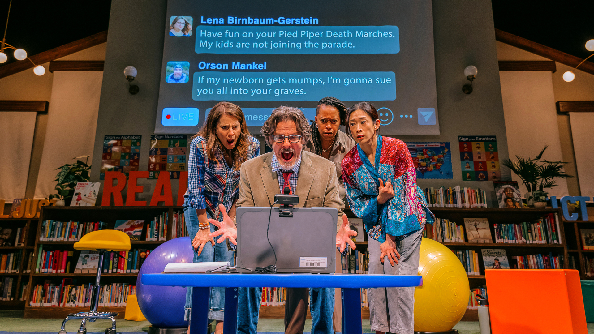 Main Photo: Mia Barron, Rick Holmes, Cherise Boothe and Camille Chen in Eureka Day (Photo by Jeff Lorch-Courtesy Pasadena Playhouse)
